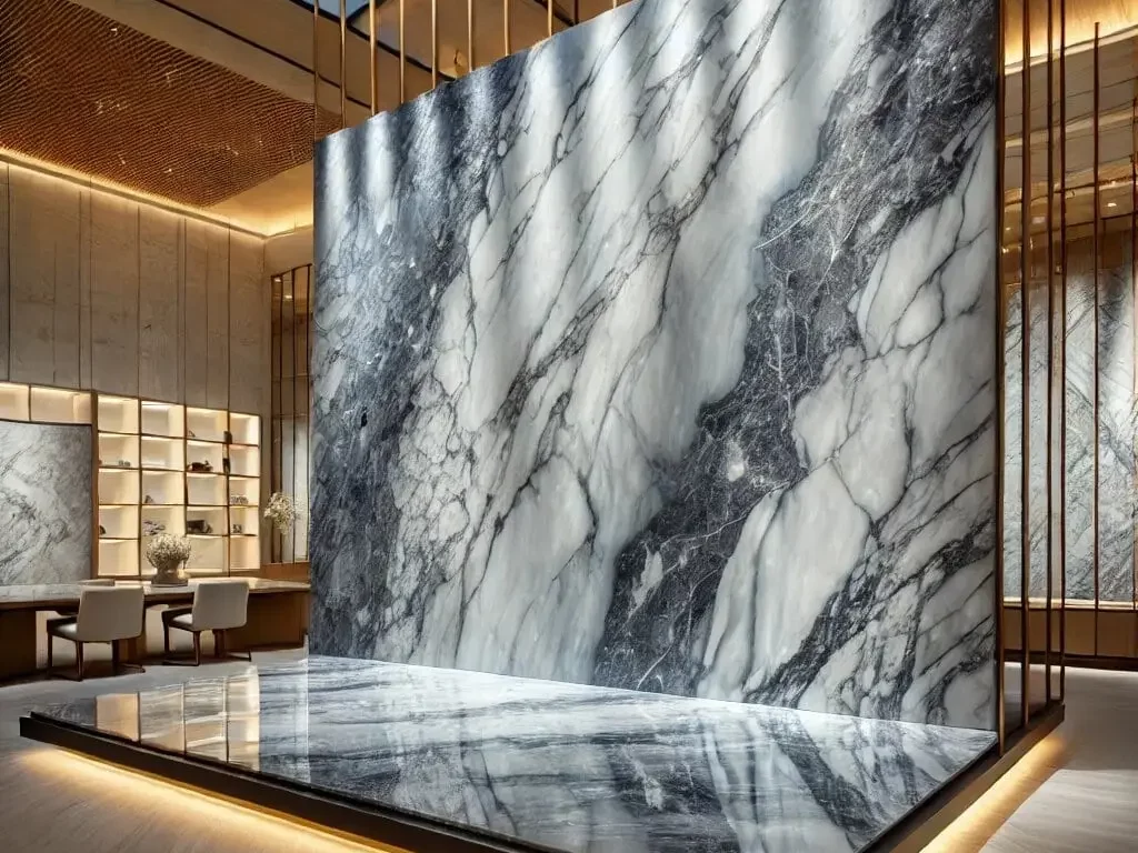 استفاده از اسلب های بزرگ سنگ چینی در دیوارهای داخلی سالن های پذیرایی، حمام و آشپزخانه، جلوه ای لوکس و خاص ایجاد می کند. رگه های طبیعی این سنگ، دیوارها را جذاب تر می کنند.